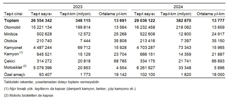 Taşıtların yıllık ortalama yaptığı kilometrelerine göre ise; çekiciler 66 bin 893 km, otobüsler 35 bin 150 km, minibüsler 24 bin 917 km, kamyonlar 21 bin 887 km, özel amaçlı taşıtlar 18 bin km, kamyonetler 15 bin 965 km, otomobiller 13 bin 859 km, motosikletler 5 bin 896 km oldu.