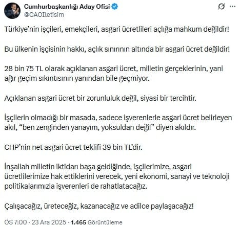 Çalışma ve Sosyal Güvenlik Bakanı Vedat Işıkhan, 1 Ocak 2026 tarihinden itibaren uygulanacak asgari ücretin net 28 bin 75 lira olarak belirlendiğini açıkladı. CHP’nin Cumhurbaşkanı adayı Ekrem İmamoğlu, “28 bin 75 TL olarak açıklanan asgari ücret, milletin gerçeklerinin, yani ağır geçim sıkıntısının yanından bile geçmiyor.” ifadesini kullanırken, kararın ardından konuşan TÜRK-İŞ Başkanı Ergün Atalay, “Rakamı görünce katılmama kararımızı ne kadar haklı olduğunu gördük” dedi